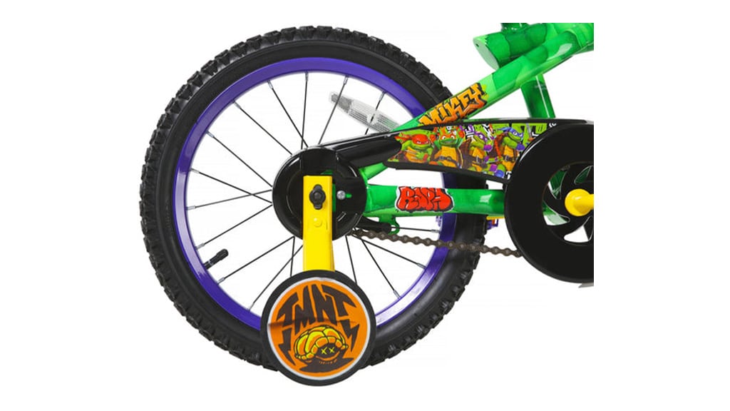 Zde je text bez uvozovek:Cowabunga! Děti nyní mohou jezdit po boku želv na 16palcovém kole Želvy Ninja od společnosti Dynacraft. Toto vozidlo má robustní ocelový rám s grafikou, barvami a výrazy Želvy Ninja, včetně nápisu Turtle Power. Malí mohou snadno vyrazit na svou další misi s pomocí snadno použitelné zadní brzdy a ochrany řídítek Želvy Ninja.