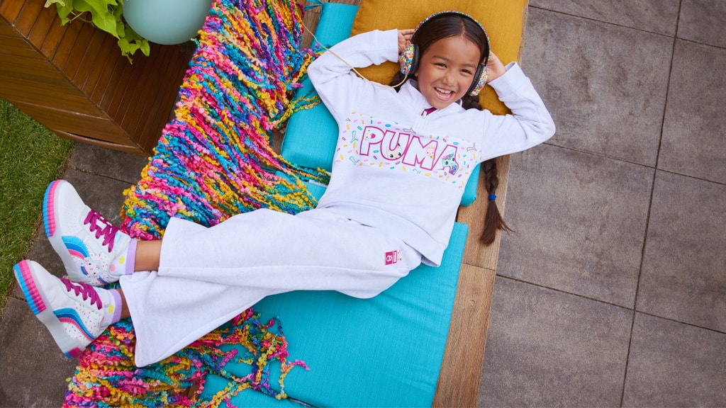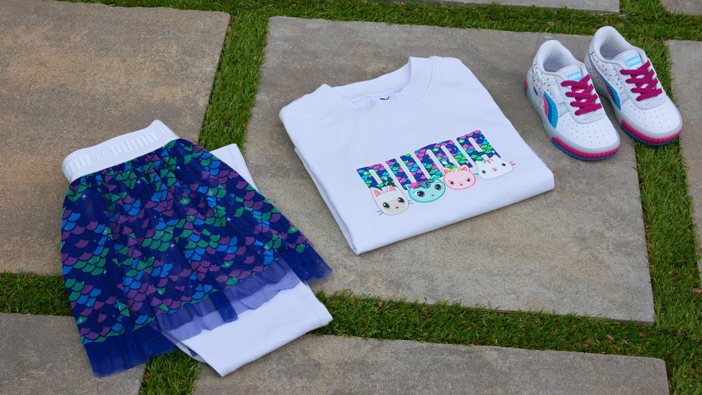 Pro děti, které si nemohou vybrat oblíbenou postavu, se PUMA postará o ně (v měkkém, svetr materiálu). Jedna z PUMA x Gabi domeček pro panenky 2dílná sada obsahuje obrázky MerCat, jejích přátel a vzor pokrytý šupinami. Sada obsahuje sukni a legíny, které představují podobný šupinový vzor.