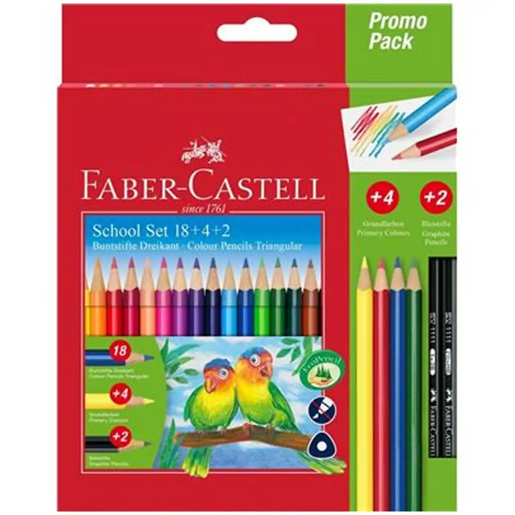 Sada barevných tužek Faber-Castell s papouškovým motivem je perfektní volbou, pokud hledáte skutečně bohatou a inspirující sadu barev pro své dítě. V sadě najdete 18 základních trojhranných barevných tužek, doplněných o 4 zářivé, primární barvy a také 2 grafitové tužky – takže zde najdete vše, co je potřeba ke kreslení, vybarvování a školním úkolům.