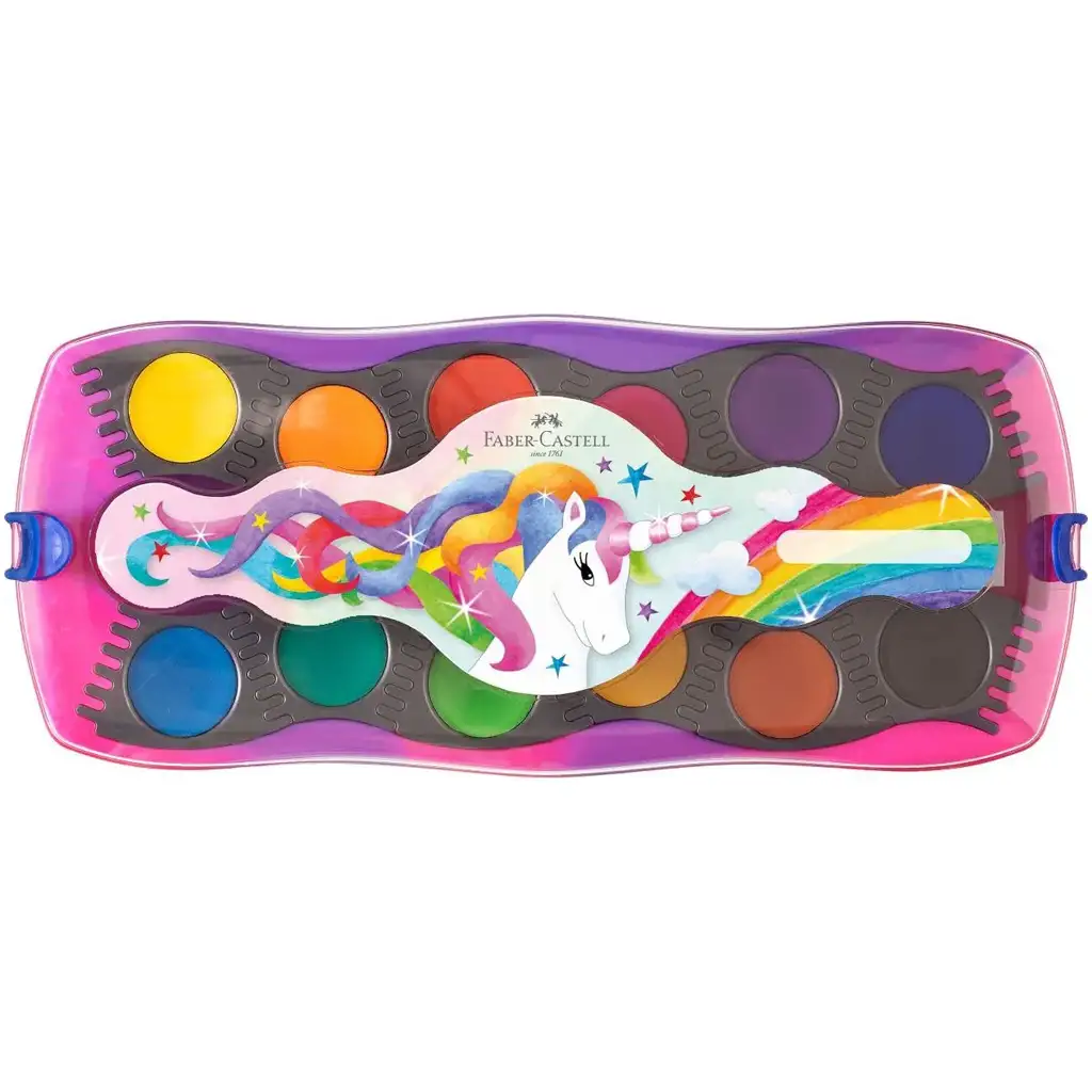 Faber-Castell: Sada vodových barev Connector 12 ks se spojovacími paletami, s jednorožcem