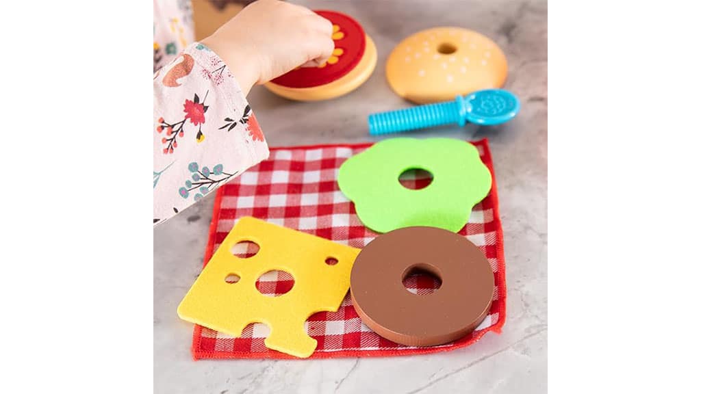 Milujeme, že tato sada obsahuje tolik prvků, které činí vaření zábavným, vzrušujícím a podnětným pro nejmladší kuchaře a milovníky hamburgerů. Například místo toho, aby dostali hračkový hamburger z jednoho kusu, jsou všechny ingredience přítomny jako samostatné části, což umožňuje dětem přizpůsobit si a vytvářet různé variace. Skvělé funkce, jako je omáčková miska, která přepíná mezi různými omáčkami, a ingredience na hamburger, které lze navléknout na dřevěnou tyčinku, činí tuto sadu zábavnější a atraktivnější než typická sada hračkového jídla. Většina dílů je vyrobena ze dřeva a plsti, takže věříme, že tato sada je vysoce kvalitní a pečlivě propracovaná.