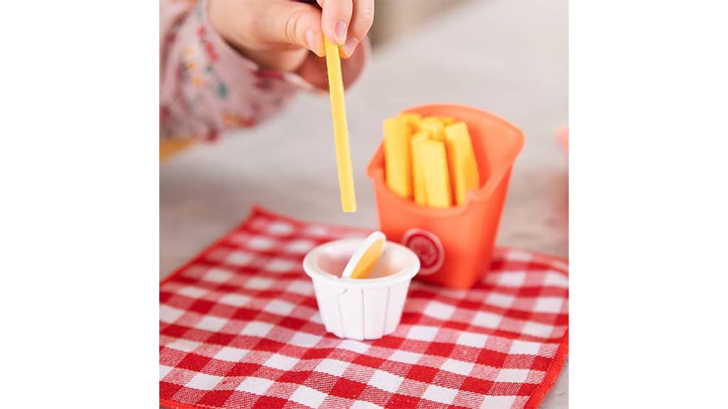 Děti si zamilují, jak ponoří plstěné hranolky do omáčkové misky, která střídá hořčici a kečup, s Pretendables Burger a Fries sadou. Tato hra není jen zábavná, ale také rozvíjí dětskou představivost a jemnou motoriku. Možnost přepínání mezi různými omáčkami dává dětem příležitost představit si různé chutě a textury, zatímco při hře kreativně formují svůj vlastní malý svět.