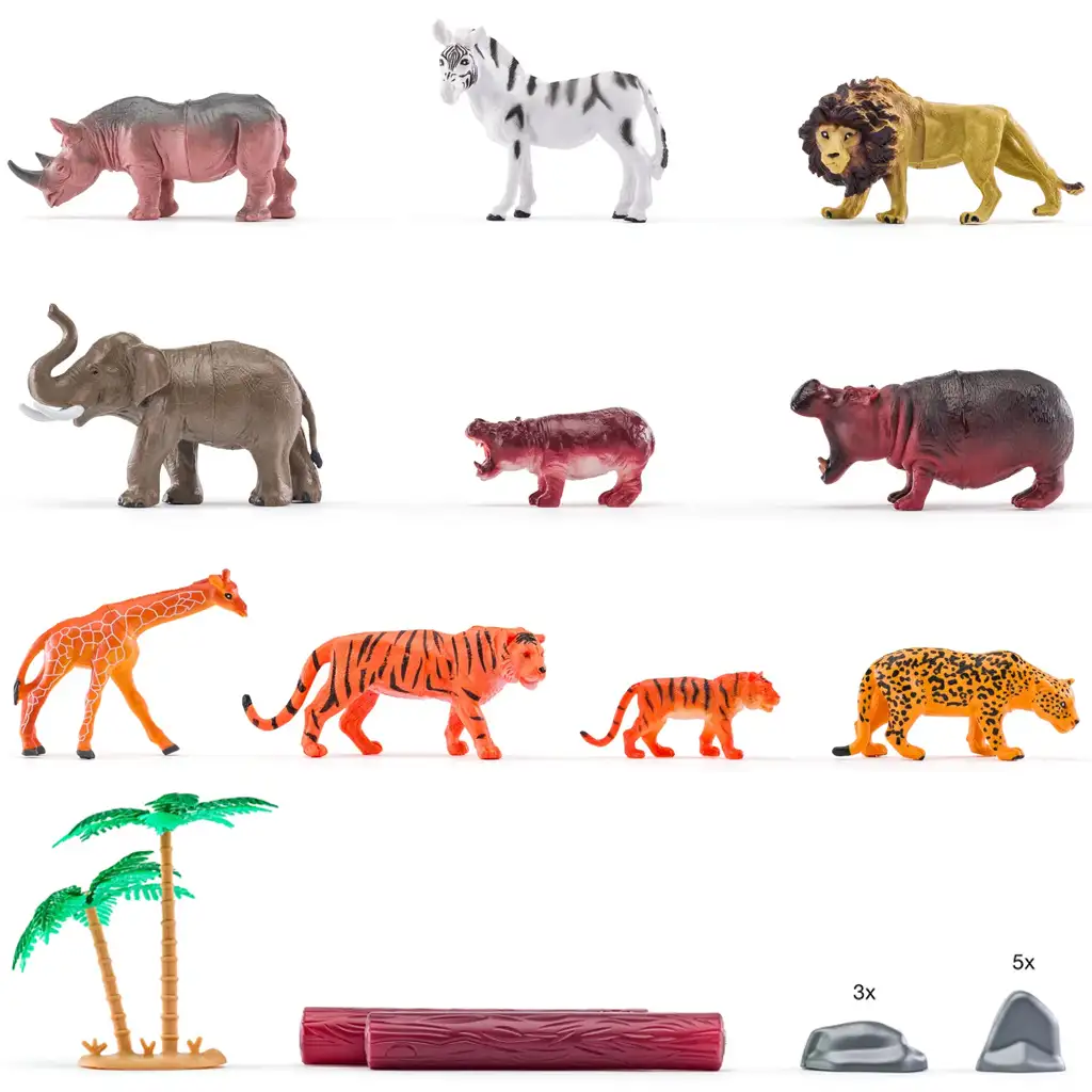 V sadě najdete nejznámější divoká zvířata, jako je silný a majestátní lev, rychlý gepard, pruhovaný tygr, obrovský slon, zebra s jedinečným vzorem a dlouhokrký žirafa. Tyto figurky zvířat jsou díky svému detailnímu zpracování realistické, takže děti snadno rozpoznají a naučí se jména a vlastnosti zvířat. Plastové stromy a skály v sadě pomáhají dětem vytvořit atmosféru divočiny, což činí hru ještě kreativnější.
