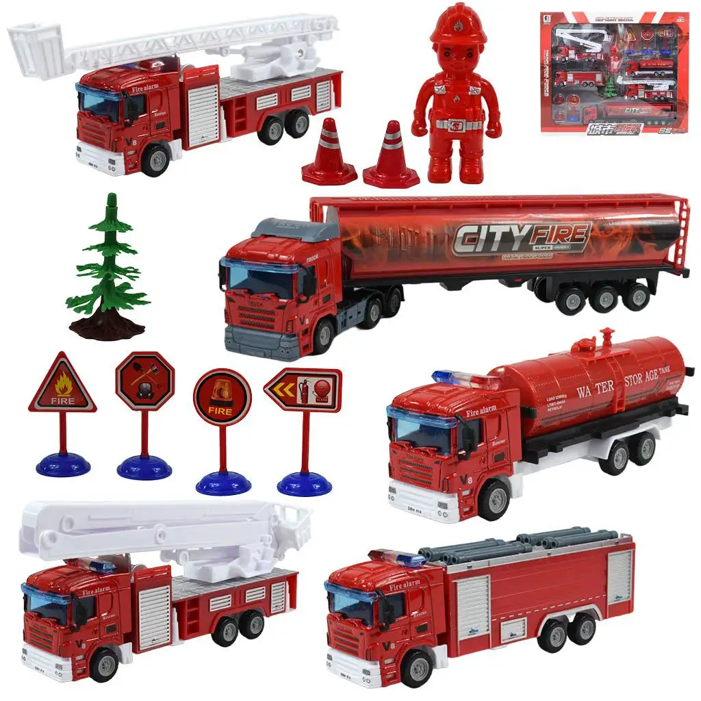 Obsah hasičské hračkářské sady je bohatý a rozmanitý. Sestava obsahuje: jeden nákladní vůz, dva hasičské vozy s žebříkem, jeden cisternový hasičský vůz, jeden hasičský nákladní vůz, dvě závory, čtyři různé značky, jednu figurku a jeden dřevěný prvek. Různá vozidla a mnoho doplňků dávají dětem možnost rozvíjet jejich kreativitu a představivost a inscenovat různé záchranné akce.