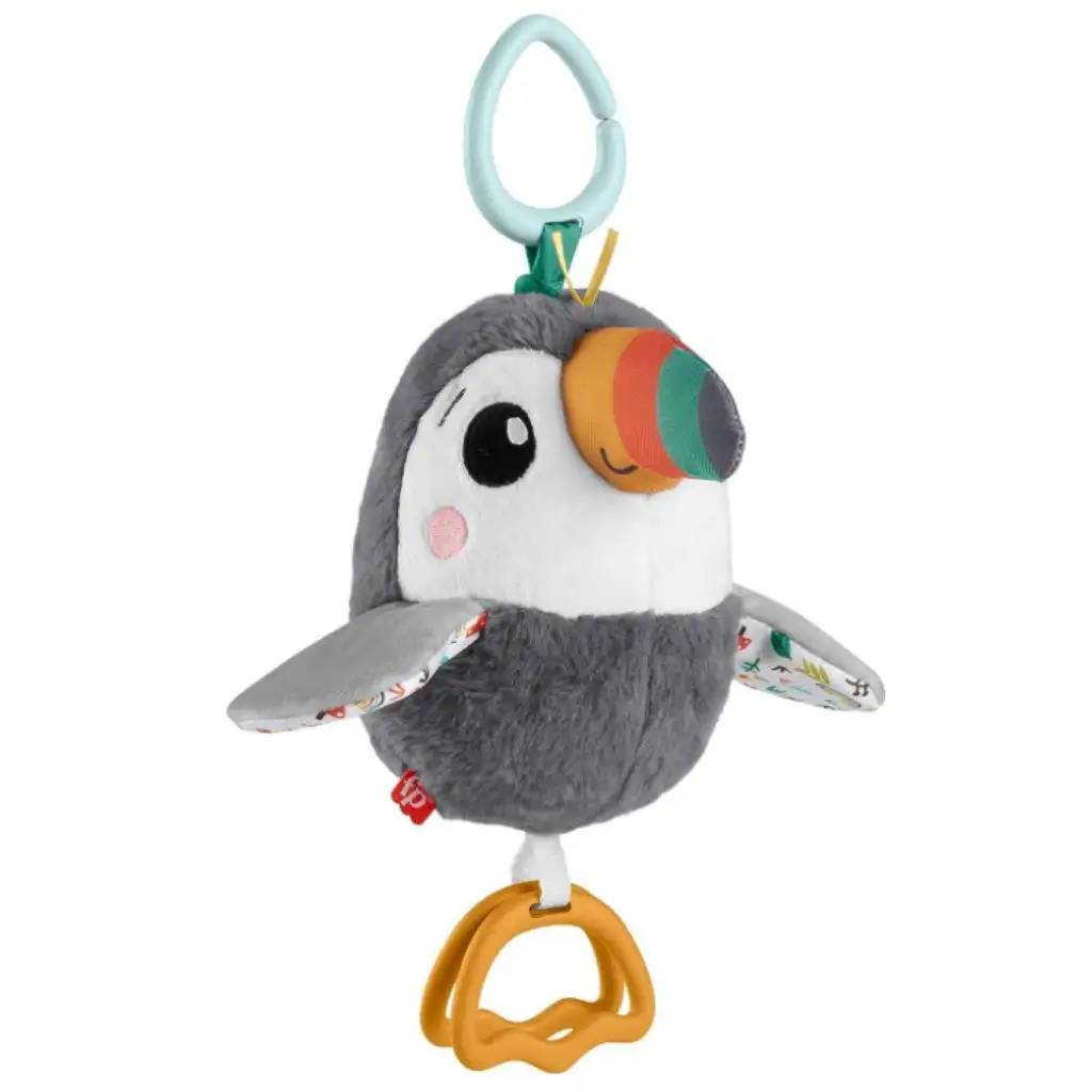 Tento roztomilý létající tukan je skvělou volbou na kočárek, který můžete vzít kamkoli s sebou. Malý tukan nabízí zábavné pohyby křídel a více smyslových možností díky speciálnímu použití materiálů, aby zabavil a okouzlil vaše miminko. Stiskněte ptáka a pusťte ho, abyste viděli, jak se tukanova křídla pohybují nahoru a dolů. Jeho měkký plyšový materiál poskytuje příjemný dotek, zobák píská, když se zmáčkne, má chrastící tlapky a v břiše je slyšet zvonění, když na něj klepnete nebo ho zatřesete. Díky svému kroužku se snadno připevní k střeše kočárku nebo k přebalovací tašce. Pomáhá posilovat jemné motorické dovednosti a rozvíjet smyslové schopnosti, navíc učí děti chápat příčinné souvislosti.