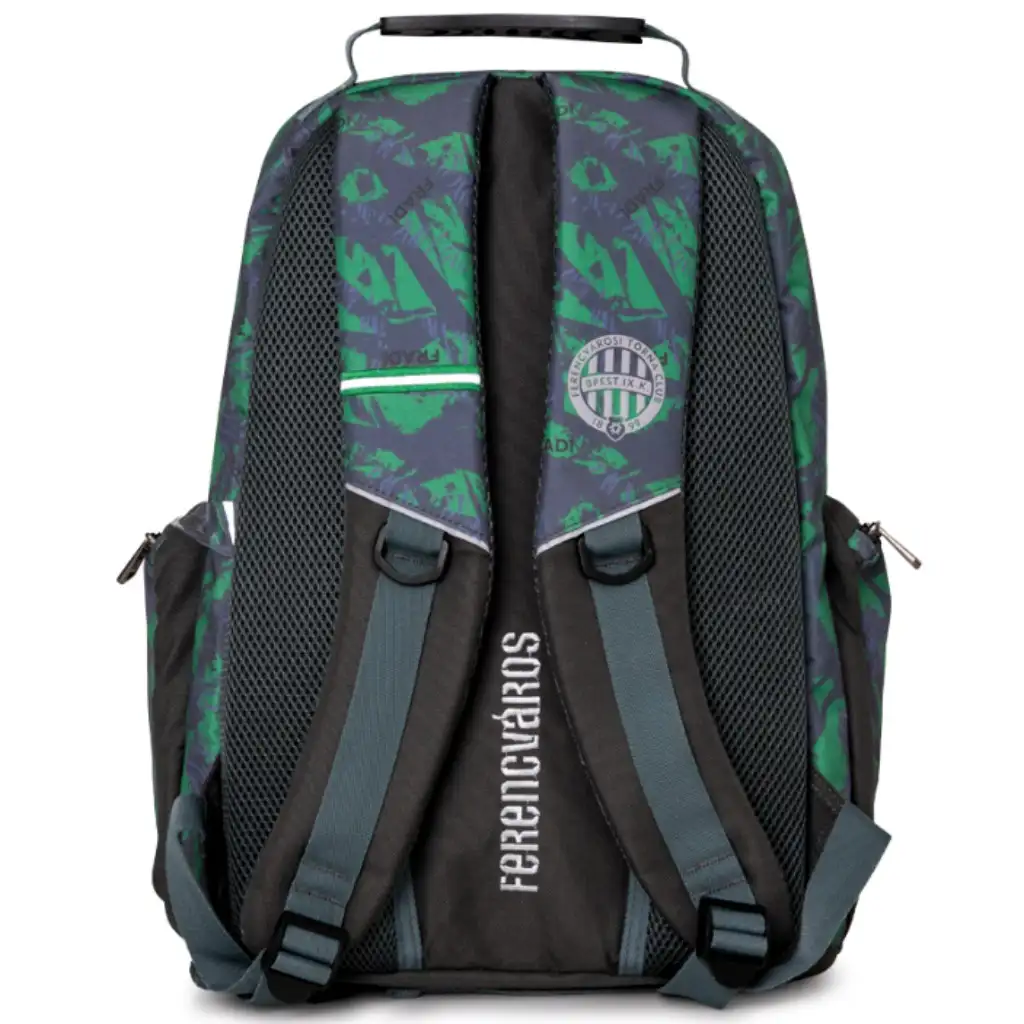 Střední školní batoh Fradi s maskovacím vzorem je ideální volbou pro starší školáky, kteří by hrdě reprezentovali svůj oblíbený tým i ve všední dny. Odvážný zeleno-černý design, nápis „Bojovat vždy, nikdy se nevzdávat!“ a znak Fradi dodávají batohu skutečně jedinečný styl. Díky rozměrům (47 x 40 x 18 cm) se do něj pohodlně vejde veškeré potřebné vybavení – učebnice, svačinový box, penál i notebook. Polstrované, ergonomické ramenní popruhy a prodyšná zadní konstrukce zajišťují pohodlí při celodenním nošení, i během nejrušnějších školních dnů.