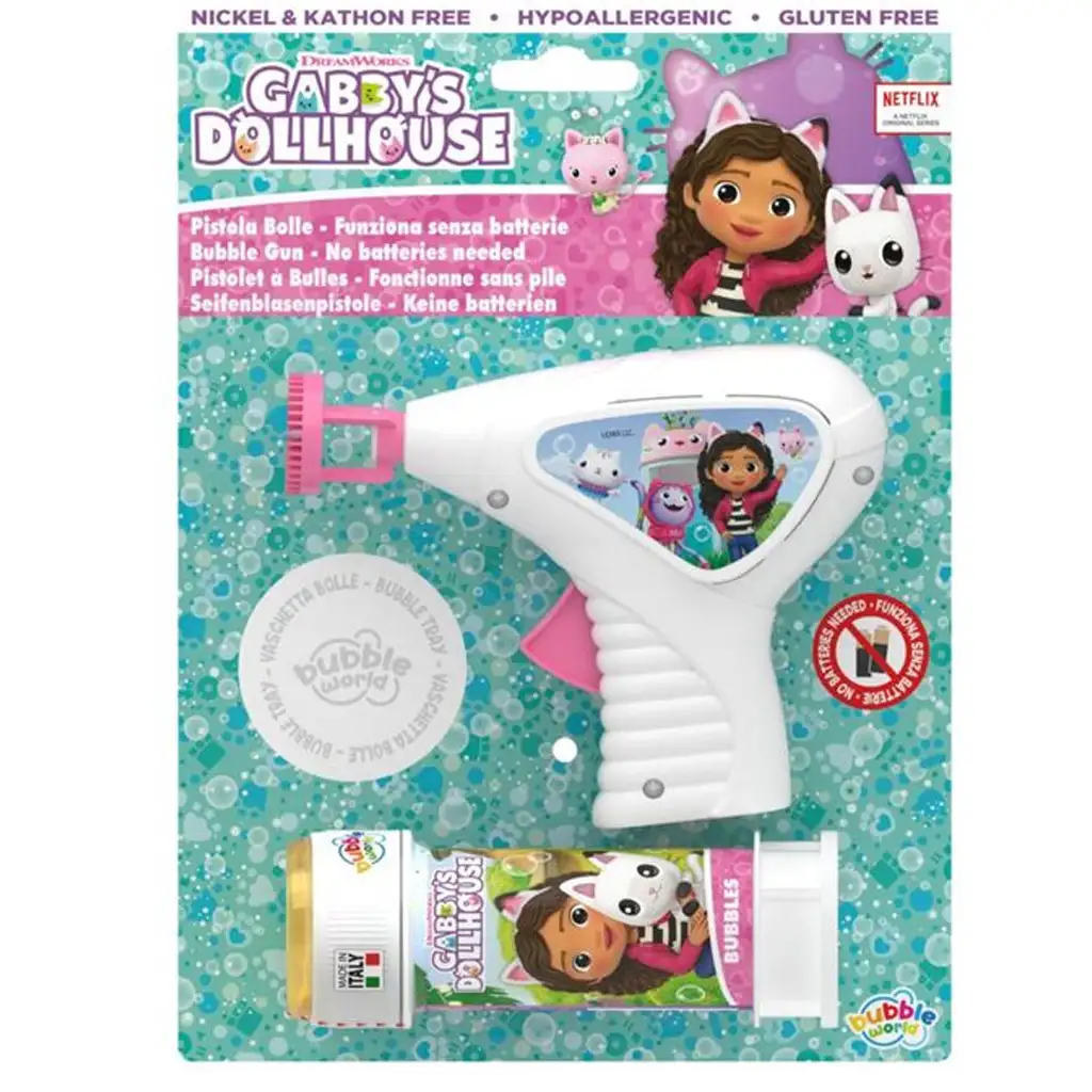 Design pistole je veselý, barevný a přátelský k dětem. Gabi a její malí přátelé na boku pistole zajišťují, že každá chvíle bublifukování bude mít pohádkovou atmosféru. Perfektní dárek pro každého fanouška Gabiho domečku!