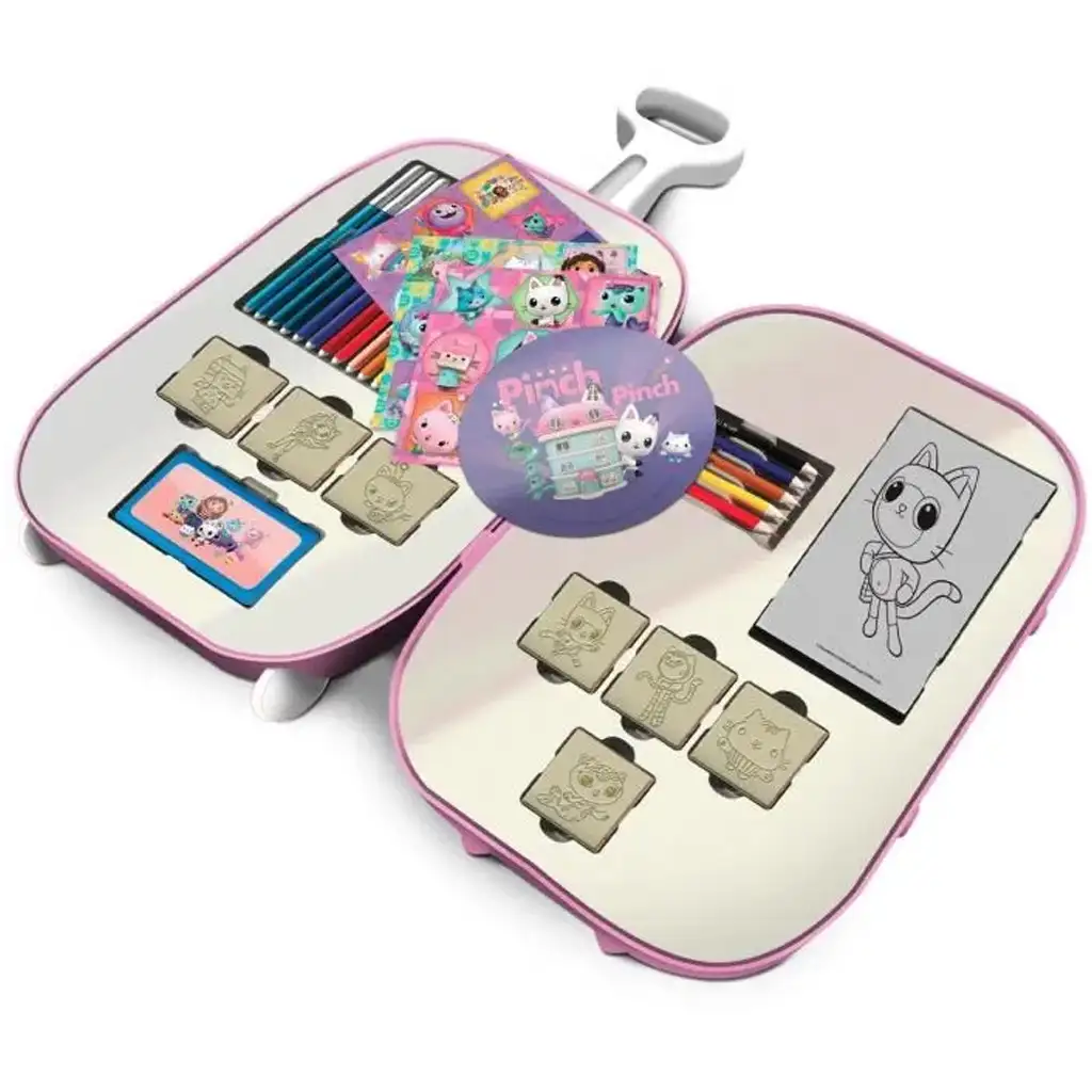 Objevte svět kreativní zábavy se sadou razítek Gabiho domečku! Tato roztomilá sada ve tvaru kufříku je ideální volbou pro všechny malé umělce, kteří milují svět Gabiho domečku. V kufříku najdete vše, co malí potřebují: barevné tužky, razítka a kreslící blok, takže mohou tvořit kdykoli a kdekoli. Snadno přenosný kufřík je vybaven kolečky a rukojetí, takže si ho děti mohou vzít kamkoli – ať už na výlet, návštěvu prarodičů nebo kreativní odpoledne v parku.