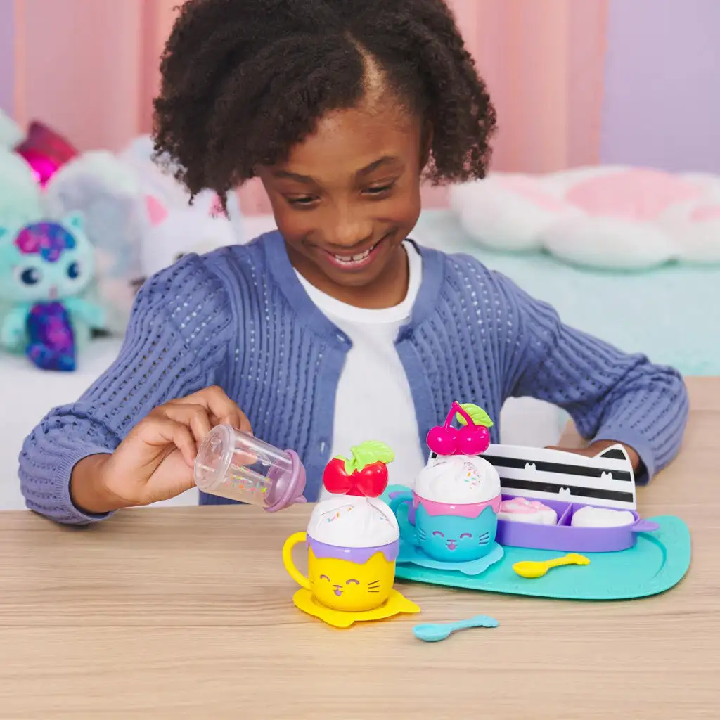 Ponořte se do nekonečného světa hraní rolí s Gabiiným domečkem a sadou Sladké dobroty! Tato kouzelná, 15dílná herní sada obsahuje roztomilé kočičí hrníčky, lžičky a podšálky ve tvaru koček, a také podnos a cukřenku. Když přijde čas na párty, naplňte hrníčky představovanou horkou čokoládou, posypte je marshmallows a ovocem a přidejte šlehačku, která se po otočení promění v jemné cukrové posypky.