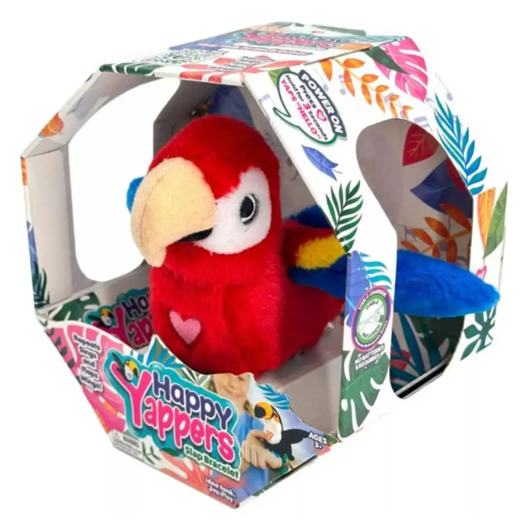 Interaktivní plyšový červený papoušek Happy Yappers je veselá a jedinečná hračka, která oživí dětskou fantazii! Stačí si ho pomocí barevného slap náramku připnout na zápěstí a papoušek bude vždy s tebou. Po stisknutí srdíčka na hrudi začne opakovat, zpívat, mávat křídly a dokonce si dokáže „povídat“ s ostatními figurkami Happy Yappers! Hračka baví zábavnými zvuky a pohyby, takže děti se mohou snadno ponořit do světa hry. Je ideální volbou jako dárek, protože je zároveň plyšovou figurkou i interaktivním společníkem, který zpestří každé dobrodružství. Nech, ať červený papoušek Happy Yappers vletí do tvého domova a může začít veselá společná zábava!
