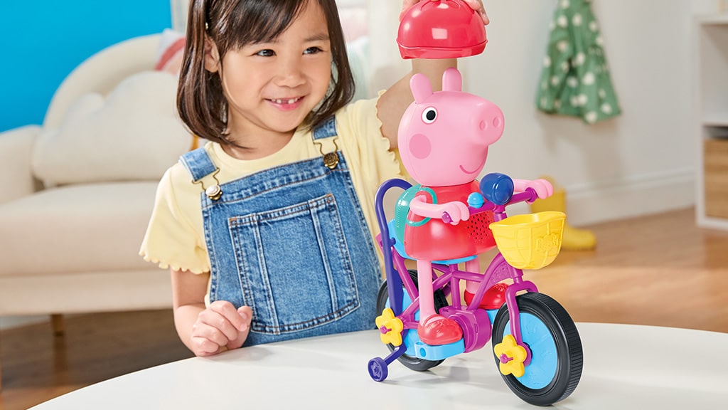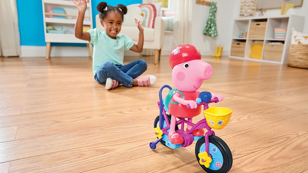 Oblíbený předškolní seriál, Peppa malac, inspiroval hru Ready, Pedal, Go Peppa, která pomáhá dětem od 3 let doprovázet Peppu při učení jízdy na kole. Součástí hry je vodicí tyč, která podporuje nejmenší při prvních hrách, a když jsou děti jistější, mohou tyč odstranit a sledovat, jak postavička samostatně šlape do pedálů. Tato hra není jen zábavná, ale rozvíjí také pohybovou koordinaci a samostatnost, zatímco si děti hrají se svými oblíbenými postavičkami Peppa malac. Ideální volba pro každé malé dítě, které miluje jízdu na kole a Peppa prasátko!