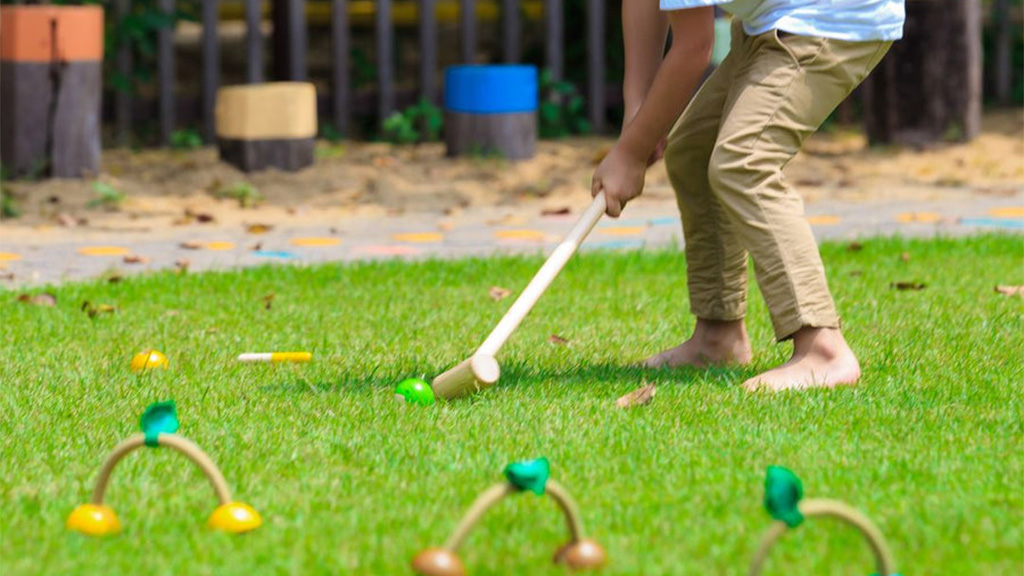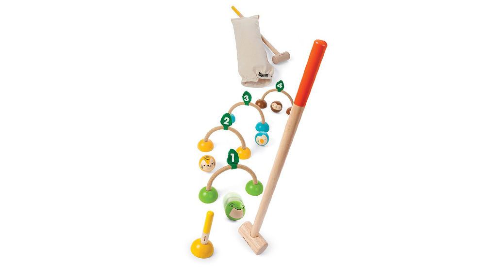 Sada kroketu PlanToy přináší udržitelný zvrat do klasické venkovní hry. Malí se mohou naučit hru s dřevěnou sadou obsahující čtyři míčky s motivy zvířat, dvě hole, čtyři branky a jeden koncový stojan.