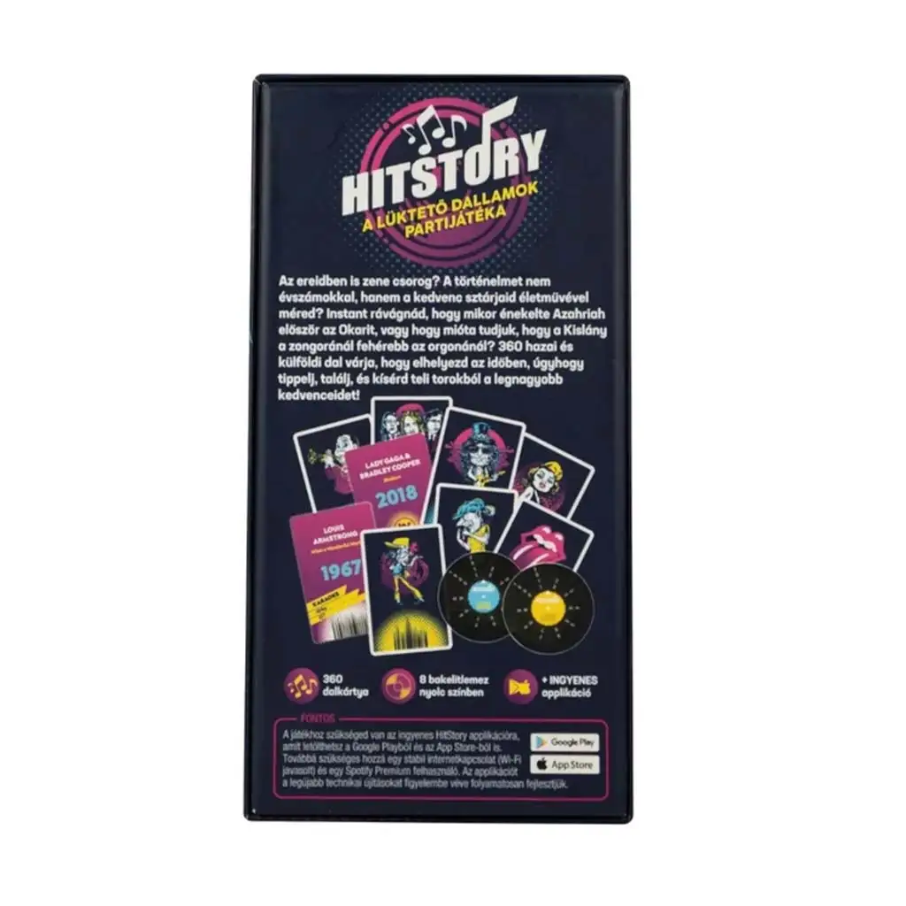 Oživte party společenskou hrou HitStory, kde je zábava zaručena a hity znějí naplno! Tato originální párty hra je zároveň hudební cestou časem i bleskovou tipovací soutěží, ve které musíte domácí i zahraniční hity seřadit podle let jejich vydání. Víš, kdy vyšel největší hit Fluora nebo kdy prorazila Adele? Pokud ne, brzy to zjistíš – a přitom se společně zasmějete nad překvapivými tipy!