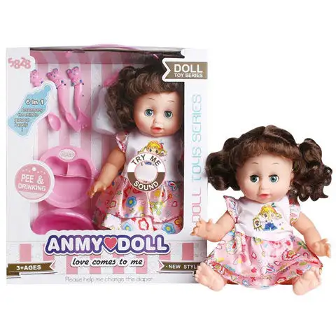 Hnědovlasá panenka, která čůrá, s hlasem a doplňkyHnědovlasá panenka, která čůrá, s hlasem a doplňky