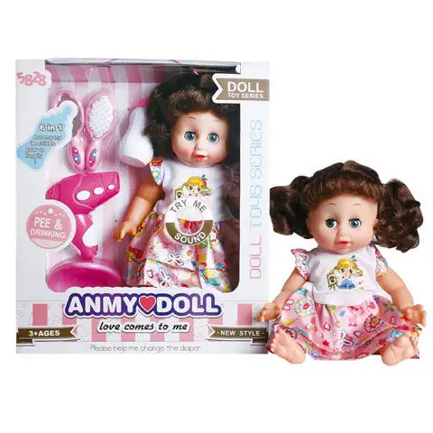 Panenky mohou být skvělými společníky pro dívky, protože s nimi mohou hodně hrát. Nyní jsme pro vaše dítě přinesli speciální panenku s hnědými vlasy, která má hnědé vlasy, modré oči, což jí dává velmi roztomilý vzhled, a také růžový overal, který jí velmi sluší. Stisknutím břicha panenky může vydávat zvuky a když ji napojíte z lahvičky s dudlíkem, která je součástí sady, může také čůrat, takže sada obsahuje také mísu. Pořiďte to svému dítěti a může začít hraní a účes.