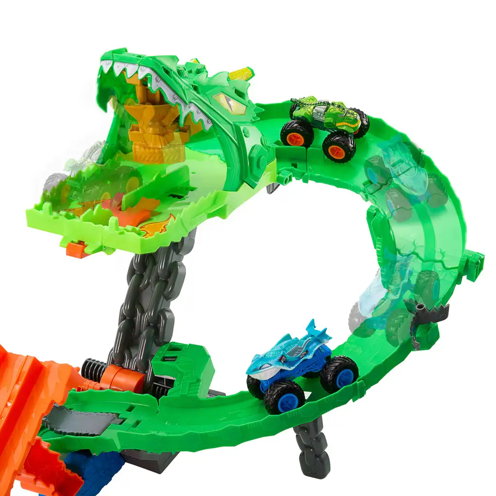 Sada obsahuje dva exkluzivní Monster Trucky v měřítku 1:64: Great Bite a Rageasaur. Auta závodí po dráze, zatímco rozbočovač s motorovou pilou náhodně rozhoduje, které vozidlo získá výhodu a které sjede z dráhy. Cílem je, aby jedno z aut dosáhlo cílové čáry, vyrazilo draka a poté se dalším nárazem dostalo do jeho tlamy, aby získalo trofej.