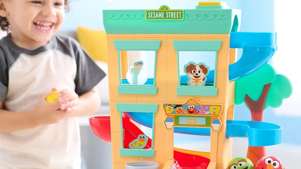 Děti mohou nechat své oblíbené kamarády z Ulice Sezam sjíždět po této klikaté, víceúrovňové herní sadě, umístit tři míčky na vrchol a poté stisknout žluté tlačítko, aby je postupně uvolnily. Při každém stisknutí tlačítka Elmo řekne vtipnou větu nebo zazpívá píseň "Here We Go Loopty-Loo".