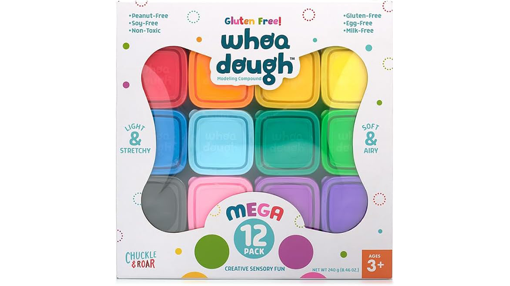 Whoa Dough modelovací hmota je neodolatelná, lehká a pružná modelína, která je měkká na dotek a snadno tvarovatelná. Obsahuje 12 barev modelovací hmoty, která neobsahuje lepek, arašídy, vejce, mléko ani sóju – je zcela netoxická a bezpečná! Vytvářejte a tvarujte nespočet výtvorů s touto smyslovou zábavou. Modelína je ideální volbou pro děti, které rády kreativně hrají, a rozvíjí jemnou motoriku. Perfektní dárek k narozeninám, svátkům nebo jakékoli zvláštní příležitosti.
