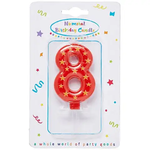Můžete uspořádat skvělou oslavu k osmým narozeninám, kde samozřejmě nesmí chybět narozeninový dort a svíčka s číslem. Červená vosková svíčka je zdobená žlutými hvězdami, takže je to také vhodný dekorační prvek pro děti. S použitím plastové podstavce lze svíčku snadno zapíchnout do vrchu dortu, který pak bude stabilně stát.
