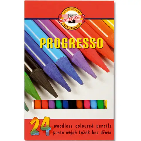 Vysoce kvalitní barevné tužky Progresso jsou bez dřevěného jádra a mají lakovaný povrch, takže tužka je celá z pevné pastely. Tužky Koh-I-Noor se již 120 let vyrábějí ve vysoké kvalitě, aby mohly vznikat krásná díla v každodenním životě. Vyznačují se výbornou ořezávatelností a snadnou manipulací, mohou se s nimi vytvářet krásné kresby s bohatými odstíny barev.