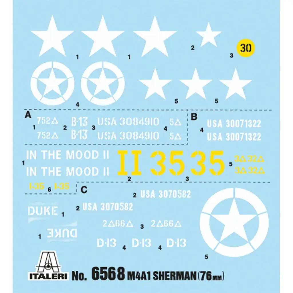 Model M4A1 Sherman v měřítku 1/35 od Italeri je vyroben s vynikajícími detaily a obsahuje deset amerických pěšáků, což umožňuje vytváření realistických dioramat. Sada obsahuje lepicí pásy T54E1, které zajišťují realistický vzhled, a díky třem volitelným označením lze vytvořit několik historických variant. Pečlivě zpracovaná věž, pancéřování a výzbroj činí model ještě autentičtějším.