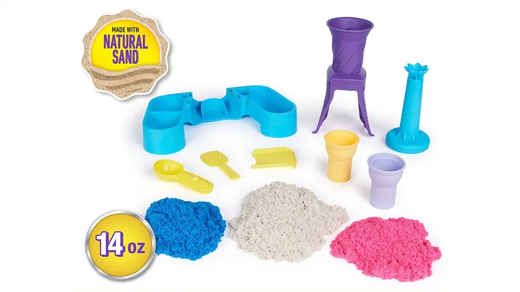 Jednoduchá, snadno použitelná sada her obsahuje dávkovač, kterým si děti mohou vytvořit charakteristický měkký zmrzlinový závit. Sada obsahuje zmrzlinovou lžíci, plastové kornouty a kinetický písek ve třech barvách: růžové, modré a jemné bílé.A samozřejmě, požitek ze zmrzliny není úplný bez několika závěrečných doteků. Děti mohou použít formy na konci zmrzlinové lžíce, aby vytlačily malé čipsy z písku, nebo prohnaly písek přes sítko, aby přidaly konfetový nádech.