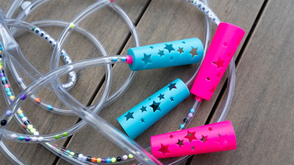 Toto je nová éra pro švihadla s designem inspirovaným přátelským náramkem. Vyber si mezi růžovou nebo modrou rukojetí. K dispozici v páru, abys je mohl sdílet se svým nejlepším přítelem navždy.