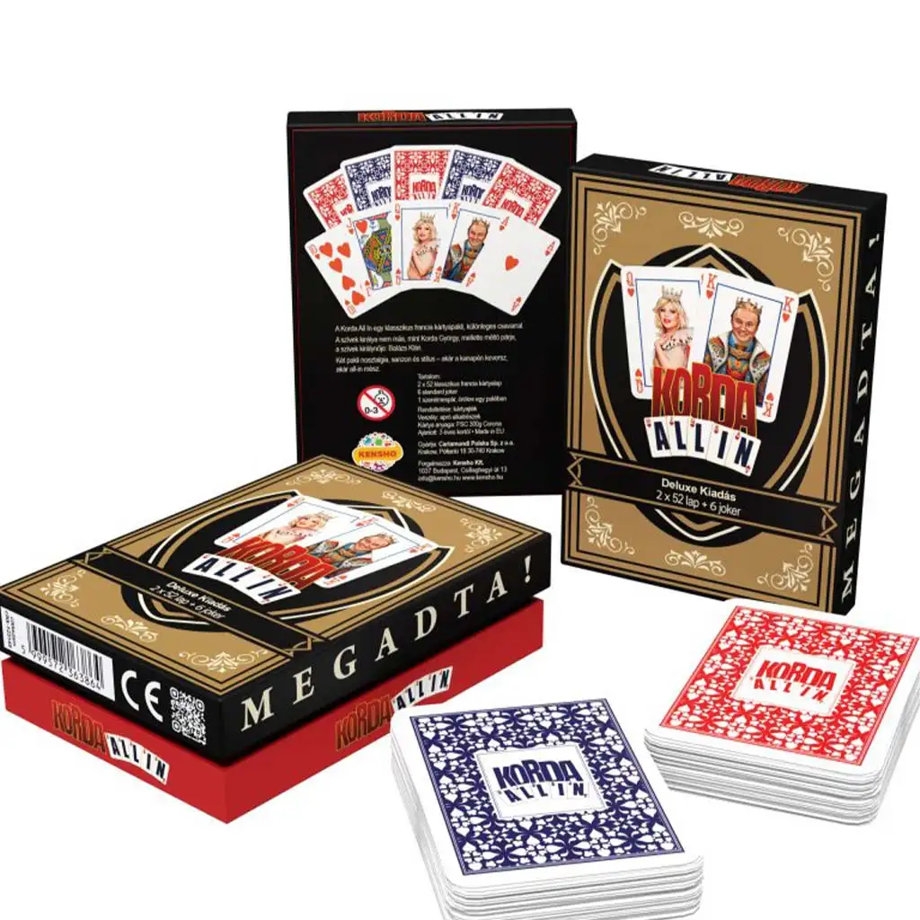Korda All-In Deluxe francouzský dvojitý balíček karet (2×52 karet + 6 žolíků) je skutečnou perlou mezi klasickými karetními hrami, která ke stolu přináší nejen radost ze hry, ale také styl a humor. Toto speciální, prémiové vydání obsahuje dva kompletní francouzské balíčky, celkem 104 karet a 6 žolíků, což z něj činí ideální volbu pro větší skupiny nebo delší a náročnější hry – ať už jde o poker, rummy, makao nebo jakoukoli jinou oblíbenou karetní hru.