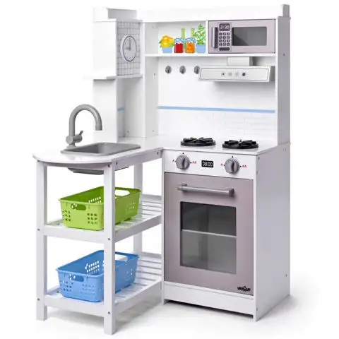 Děti rády napodobují vše, co dělají jejich rodiče, a tak se s radostí zapojují i do práce v kuchyni. V této sadě najdete skvělou rohovou kuchyňskou soupravu, která obsahuje vše, co malé děti potřebují k úžasné hře. Velkou část kuchyňské sestavy tvoří trouba a varná deska, nad kterou se nachází odsavač par a také mikrovlnná trouba. Další část sestavy tvoří dřez s dvěma policemi pod ním, které poskytují místo pro plastové koše.
