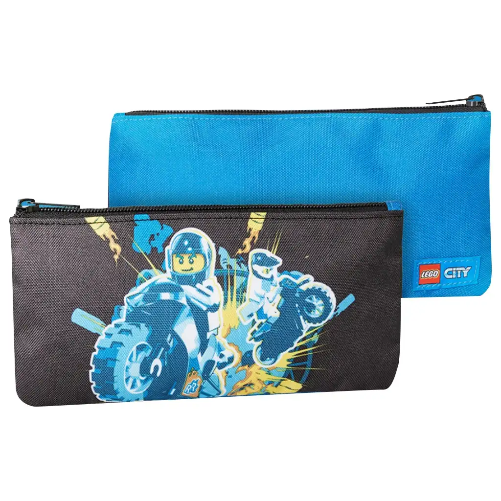 Pouzdro má oboustranný design: na jedné straně je dynamická, akční scéna s LEGO motorkáři, zatímco druhá strana je v živé modré barvě s logem LEGO City. Pevná přihrádka na zip ochrání uložené psací potřeby před vypadnutím a nabízí dostatek místa pro pera, tužky, gumu a dokonce i pravítko.