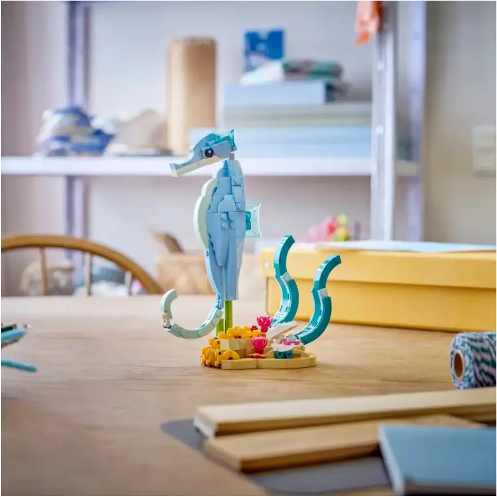 S LEGO® Creator 3 v 1 Mořská zvířata: Úžasní delfíni (31385) si děti od 9 let užijí spoustu zábavných příběhů. Stavební kostky této mořské sady nabízejí dívkám i chlapcům 3 různé možnosti stavění. Mohou si postavit dynamické, polohovatelné modely dospělého a mláděte delfína, jak surfují na vlně nad korály. Poté je lze přestavět na polohovatelného mořského koníka na stojánku ozdobeném mořskými řasami a na polohovatelnou mušličku; nebo lze postavit kraba, který je umístěn vedle mořských rostlin a medúzy. Po skončení hraní lze kterýkoli z těchto krásných modelů hrdě vystavit na polici nebo na stole, protože poslouží i jako nádherná dekorace přírody. Tato sada LEGO Creator 3 v 1 inspiruje dětskou představivost a je zároveň skvělým dárkem pro všechny, kteří milují mořská zvířata. Díky aplikaci LEGO Builder mohou děti s jistotou stavět své stavebnice – mohou modely zvětšovat, otáčet ve 3D a sledovat svůj pokrok prostřednictvím snadno pochopitelných digitálních návodů. Důležité: modely nelze postavit současně! Sada obsahuje 542 dílků.