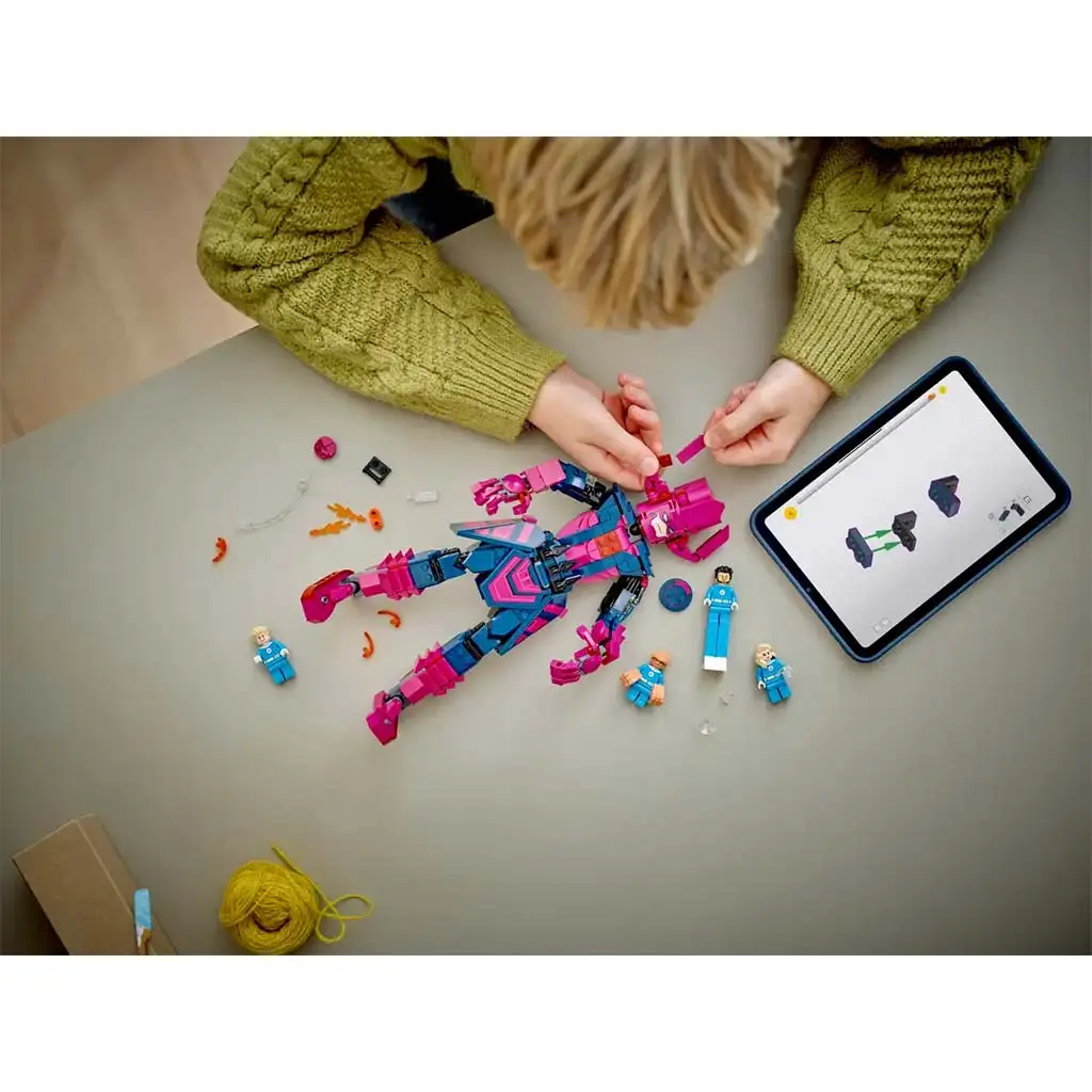 Stavebnice LEGO ǀ Marvel Fantastická čtyřka obsahuje 4 minifigurky: Mr. Fantastic s prodlužovacíma nohama, Human Torch se dvěma ručními kanóny, plamenovými prvky na nohách a průhledným stojanem, aby „létal“; Invisible Woman, která drží dva energetické štíty; a The Thing se svými obrovskými a silnými pažemi. Nastavitelná sestavitelná figurka ikonického padoucha Galactuse z filmu měří 28 cm. Figurka lze polohovat, aby mohla bojovat se superhrdiny, a je připravena na spoustu akce. Pro další digitální zážitek mohou stavitelé modely zvětšovat, otáčet ve 3D a sledovat svůj postup v zábavné a intuitivní aplikaci LEGO® Builder. Sada obsahuje 427 dílků.