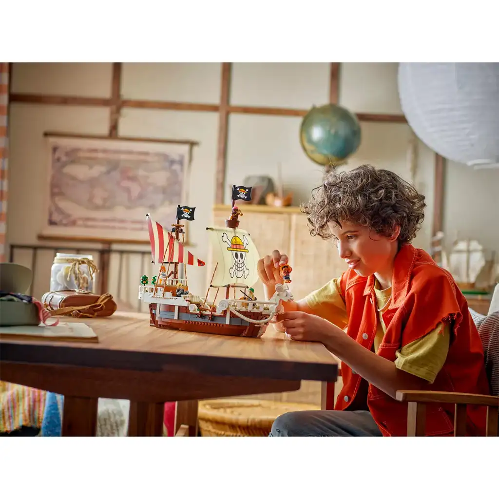 Ikonická loď má spoustu vnitřních prostor: kajutu posádky, kuchyni, sklad a dílnu na doplňky. K modelu patří také 5 LEGO ONE PIECE minifigurek. Luffy sedí na ovčím přídi na čele lodi, pod ním je dělo; Zoro odpočívá a trénuje na palubě; Nami řídí kormidlo vzadu, kde rostou její oblíbené mandarinky; Usopp šplhá na stožár a střeží z koše; Sanji nese nádobí po schodech do kuchyně. Sada obsahuje 4 „Wanted“ (hledané) plakáty. V aplikaci LEGO Builder si děti mohou modely přibližovat, otáčet ve 3D a sledovat svůj pokrok. Sada se skládá z 1376 dílků.