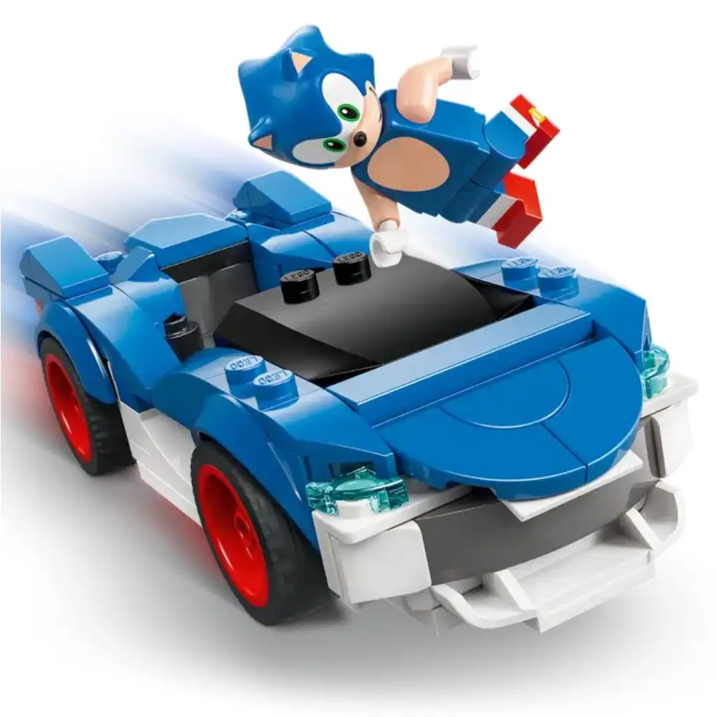 • ZAŽIJ AKCI Z VIDEOGAME! – Závodní auto inspirované hrou Sonic Racing: CrossWorlds má široké červené disky a parádní modro-bílé zbarvení