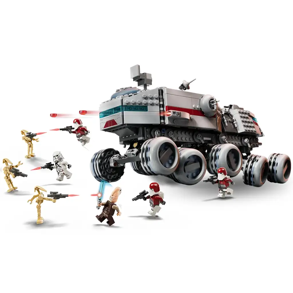 • Stavitelné herní transportní vozidlo pro děti – Nakloň model a vydej se do akčních bitev Star Wars: Klonové války s detailně zpracovaným modelem Republikánského Juggernautu postaveným z LEGO® kostek!