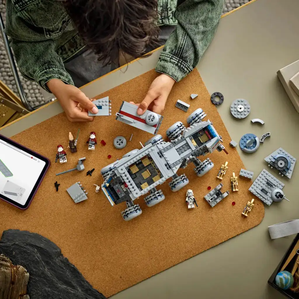 Zpestřete dětskou hru s aplikací LEGO Builder, kde si během stavění mohou model Star Wars vozidla prohlížet, zvětšovat a otáčet ve 3D. Tato sada obsahuje 813 dílků.