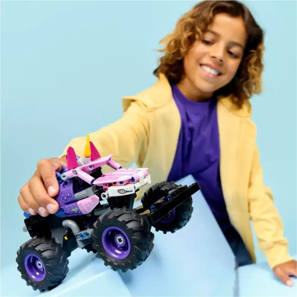 • MONSTER JAM™ STAVEBNICE – Natahovací náklaďák LEGO® Technic Monster Jam Sparkle Smash™ (42220) nabízí hodiny zábavy všem dětem od 7 let, holkám i klukům, kteří milují monster trucky a jednorožčí hračky