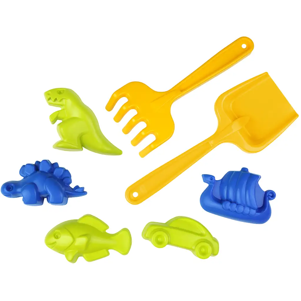 7dílná sada: lopatka, hrábě a 5 forem na písek