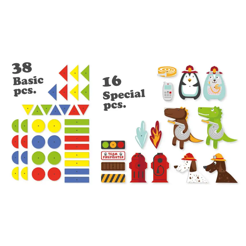 Tato sada s tématem hasičů umožňuje dětem vytvářet živé a zábavné hasičské scény. Tvary a nástroje v sadě pomáhají malým rozvíjet jejich manuální zručnost a kreativitu, zatímco zároveň nabízejí zábavnou hru.