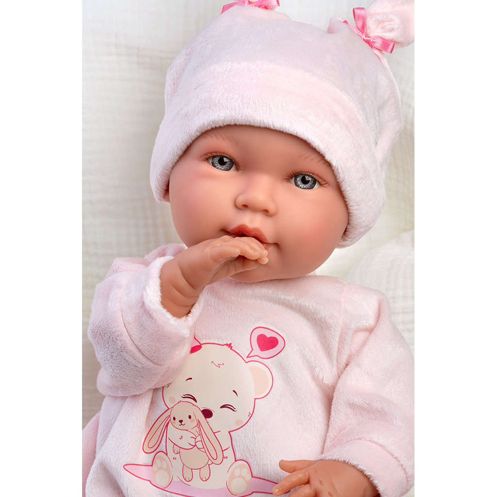 Llorens: Abril — pláčící panenka 42 cm v čepičce s králičími ušima, se spacím pytlem. hodnocení: