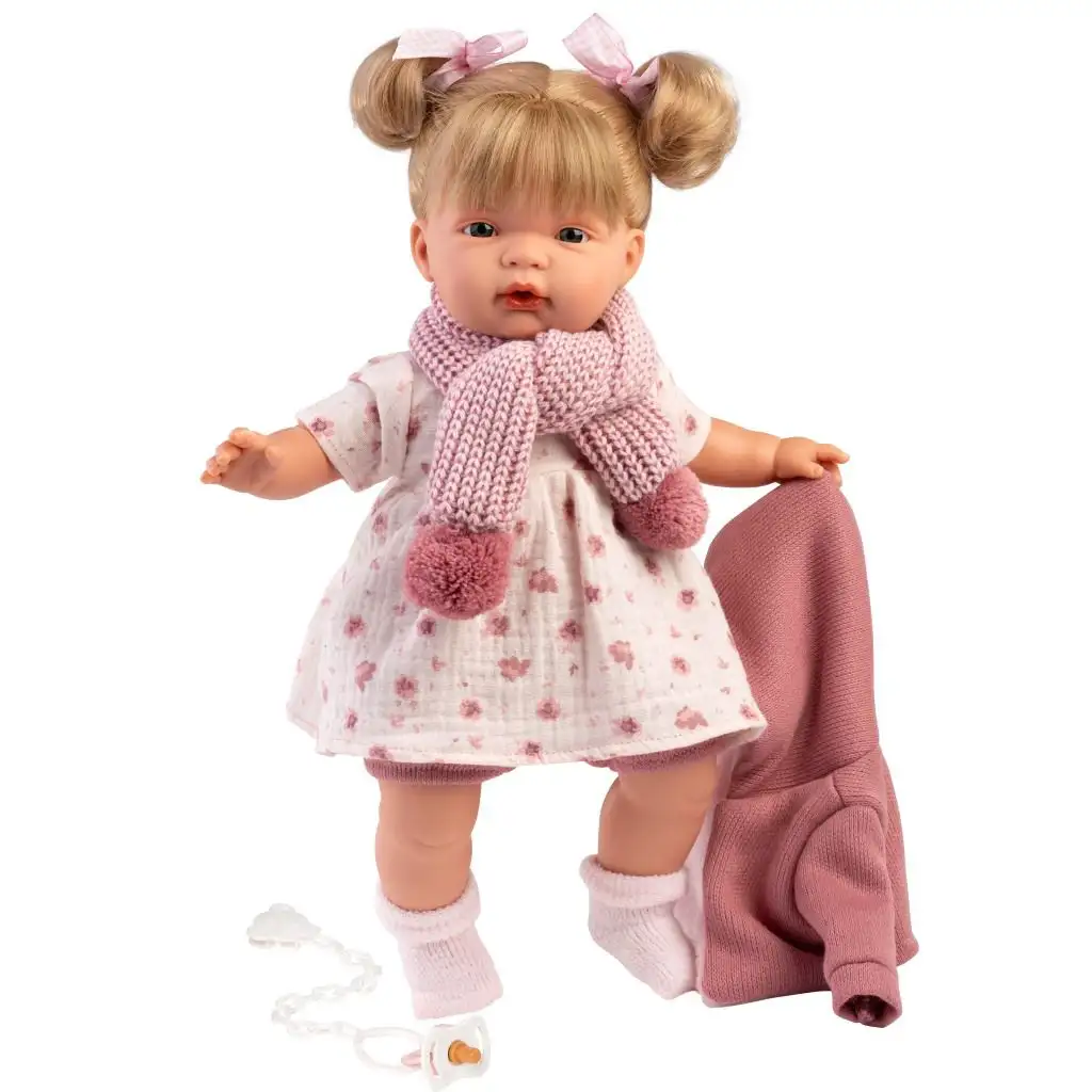 Llorens: Joelle 38cm panenka s hlasem v pleteném kabátu se šálou.Llorens: Joelle 38cm panenka s hlasem v pleteném kabátu se šálou.