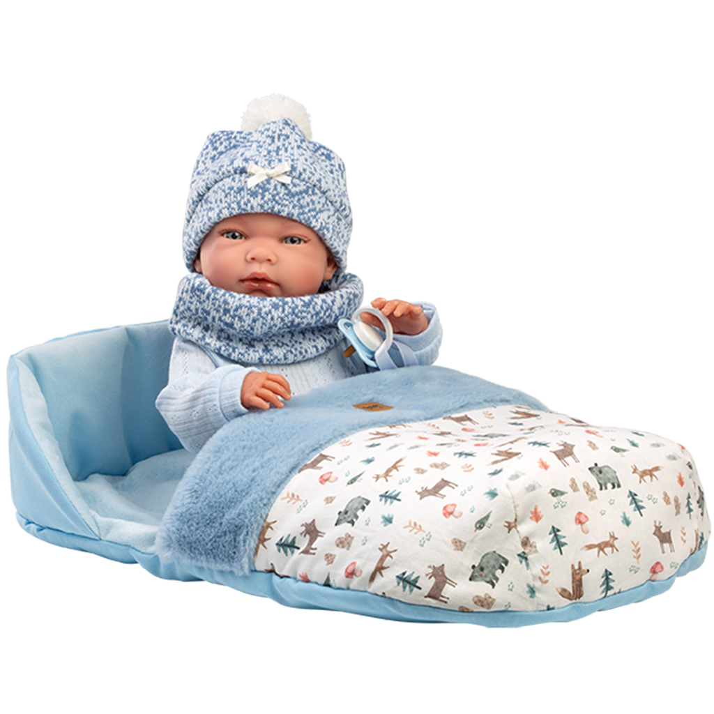 Llorens: Nico, novorozená panenka o výšce 40 cm s fusakem, je perfektní volba, pokud hledáte opravdu realistickou a výjimečnou panenku pro své dítě. Panenka na obrázcích je oblečená v měkkém modrém pleteném oblečení, s čepičkou a šálou, což jí nejen dodává roztomilý vzhled, ale také dělá hru ještě útulnější. Do přiloženého vzorovaného měkkého spacího pytle můžete panenku snadno zabalit, takže děti si mohou hrát na uspávání a prožívat každý okamžik péče. Detailní zpracování a milý výraz obličeje podporují emocionální pouto a rozvíjejí představivost.