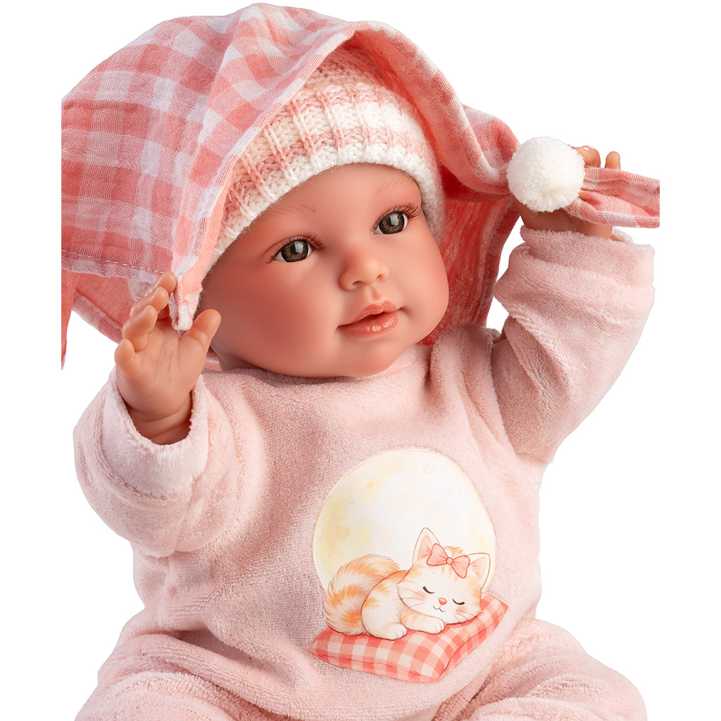 Panenka Llorens Olivia o velikosti 38 cm, která pláče, s kostkovanou dekou poskytuje vašemu dítěti skutečně útulný herní zážitek. Panenka zobrazená na fotografiích, oblečená do měkkého růžového overalu, si svým milým a klidným výrazem okamžitě získá srdce. Malá kostkovaná deka není jen roztomilým doplňkem, ale je také ideální pro péčovatelské hry. Panenka vydává pláč, díky čemuž je hra ještě realističtější, a s přiloženým dudlíkem ji lze snadno utišit. Ideální volba, pokud chcete rozvíjet empatii a představivost svého dítěte s roztomilou panenkou k mazlení.