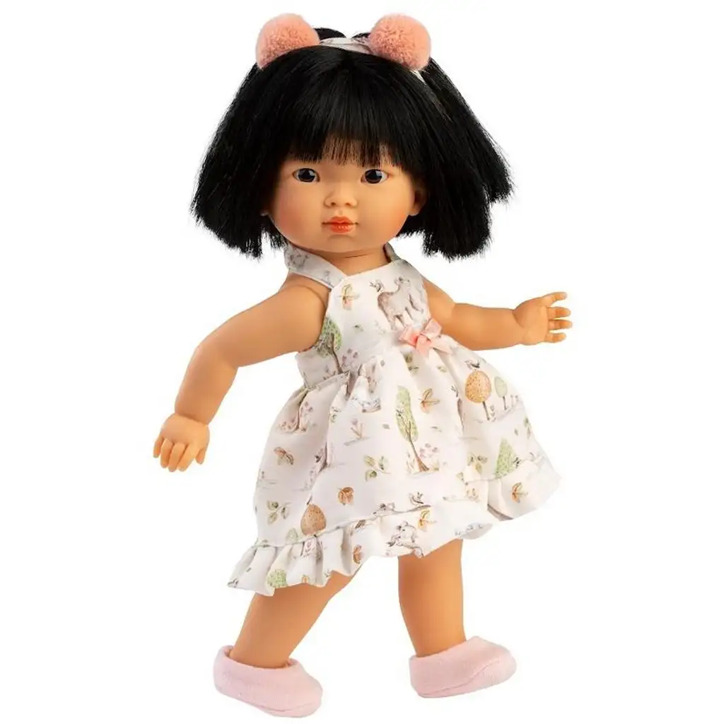 Lu je okouzlující, 28 cm vysoká panenka, která je dokonalou kombinací půvabu a hravosti. Díky své malé velikosti je ideální i pro nejmenší děti – snadno se drží, objímá a lze ji vzít kamkoli s sebou. Její růžová čelenka s třásněmi a přirozeně vypadající rovné černé vlasy ji činí opravdu výjimečnou a stylovou, zatímco veselý letní šaty s motivem zvířat zajišťují, že každá hra bude radostná.