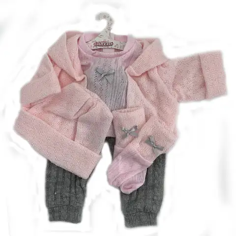 Skvělá volba pro rozšíření šatníku našich 43cm panenek Llorens je tato sada oblečení, ve které najdeme úžasnou kolekci. V síťovaném balení je roztomilý růžový kardigan, ke kterému patří pletená čepice a ponožky, a také bílé kalhoty zdobené roztomilými motivy medvídka a králíčka. Oblečení dokonale padne na naši 43cm panenku Llorens nebo na jiné panenky této velikosti podle vlastního výběru. Kvalitní výběr materiálů a nádherně propracované kousky oblečení jistě potěší každého.