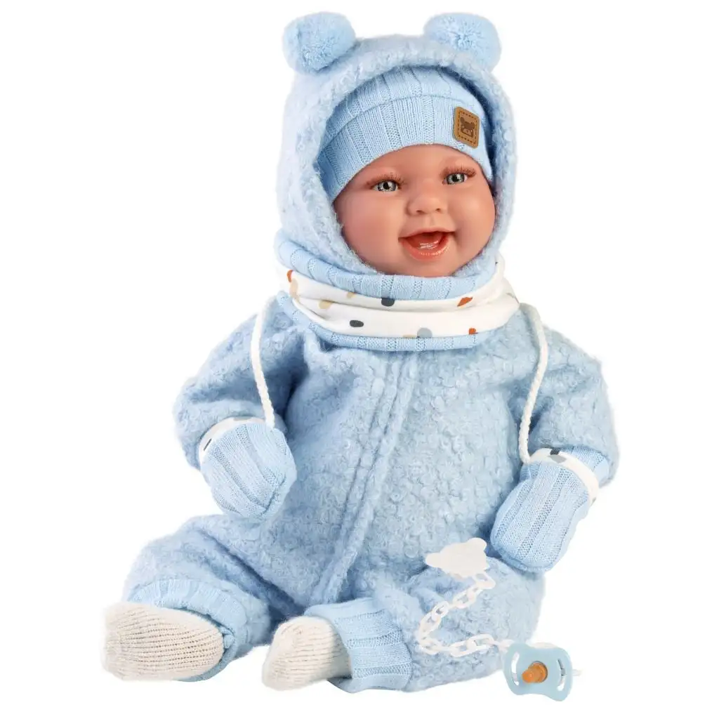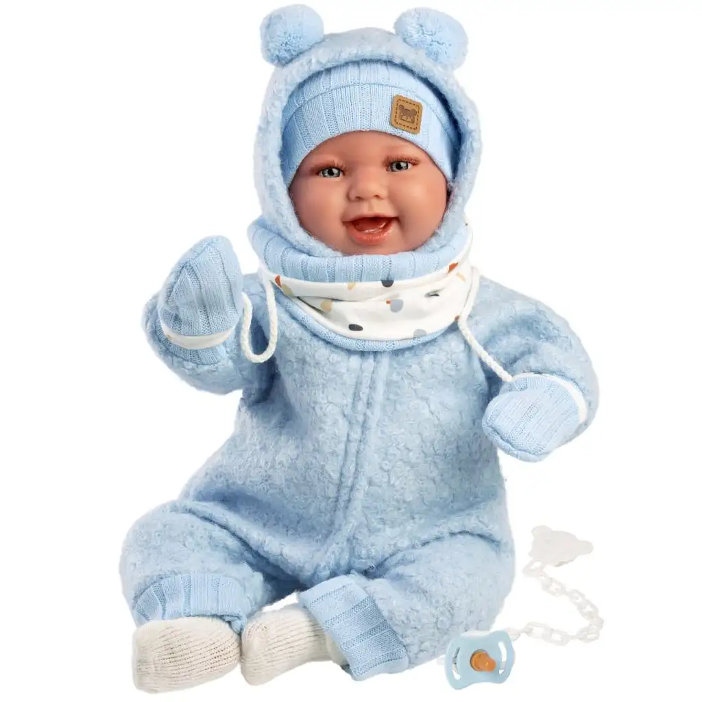 Llorens: Talo Sonrisas 44cm novorozenecká panenka se zvukem v modrém kapucovém oblečení.