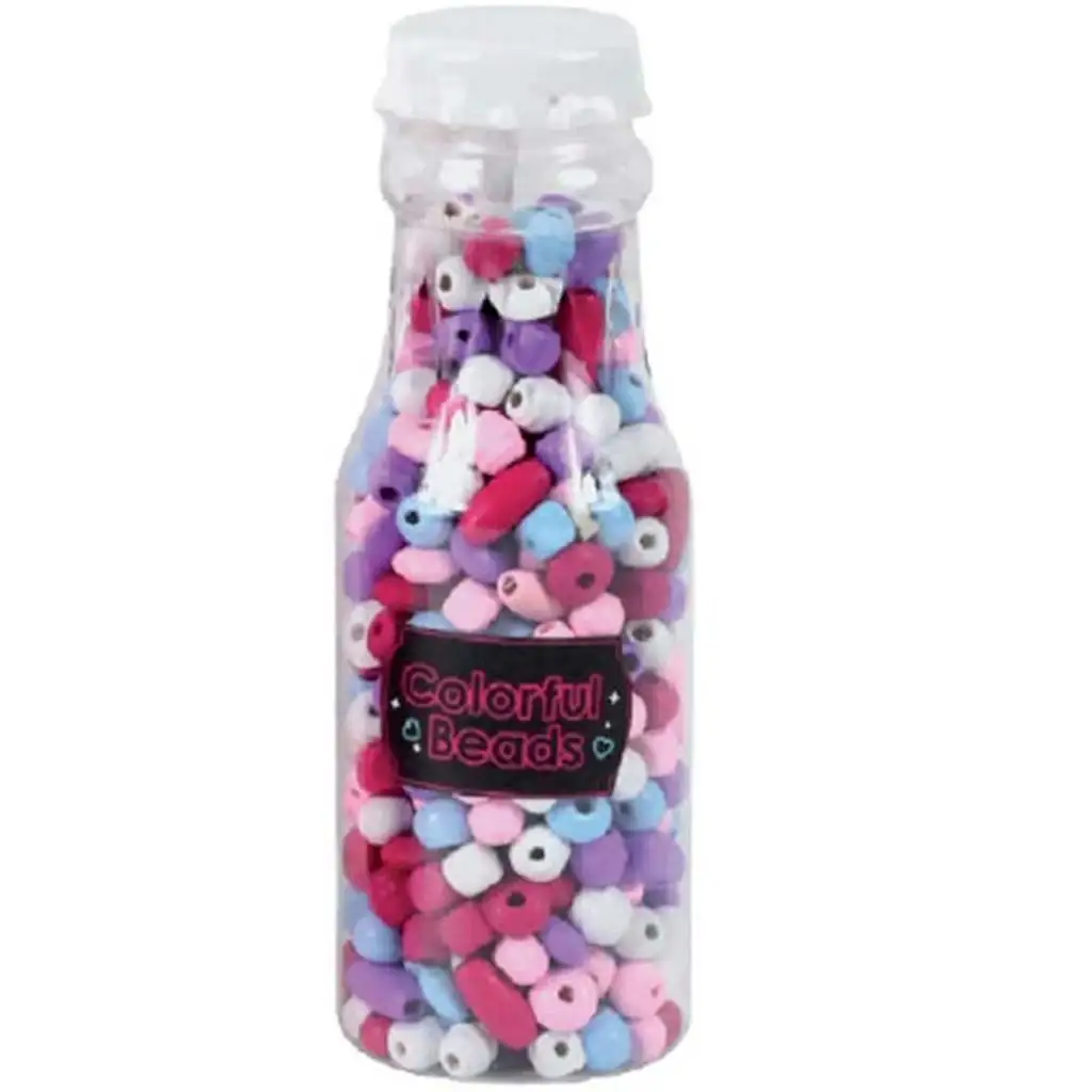 Stylová plastová nádoba ve tvaru „mléčné lahve“ je plná pestrých, rozmanitě tvarovaných korálků v živých barvách, mezi nimiž najdete odstíny růžové, fialové, červené, modré a bílé – dokonale sladěné pastelové i syté tóny.