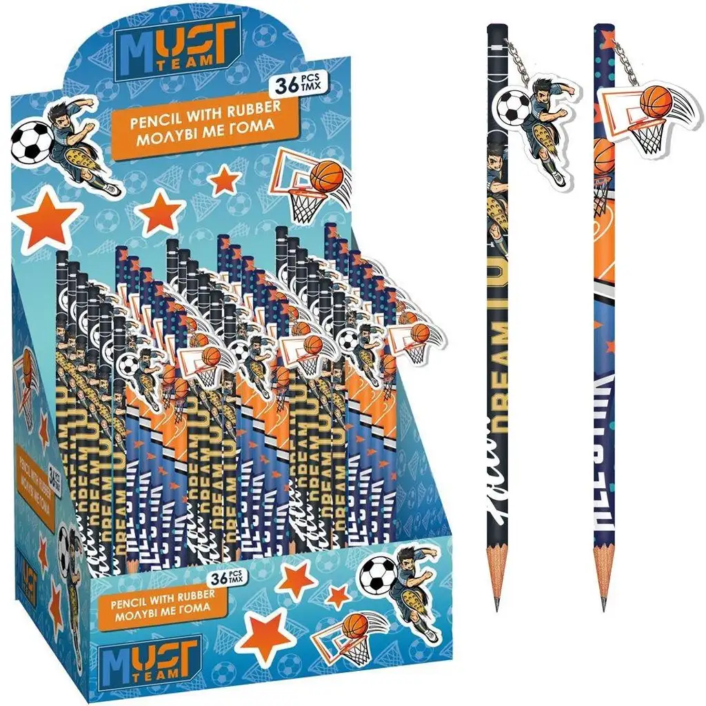 Na konci tužky je gumová figurka zavěšená na řetízku – u jedné varianty basketbalový koš, u druhé fotbalista v akci – která slouží nejen jako praktická guma na opravu chyb, ale také jako stylový doplněk do penálu. Tužky mají silnou grafitovou tuhu, snadno se ořezávají a jsou pohodlné i pro malé ruce.