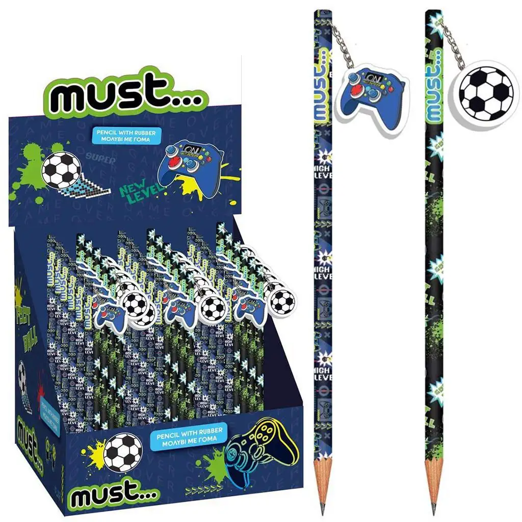 Překvap svého syna opravdu skvělou grafitovou tužkou Luna, která má zabudovanou gumu a je k dispozici ve dvou variantách! Tyto tužky nejsou jen praktické, ale přinášejí vzrušující svět fotbalu a videoher do školního každodenního života. Tužky z kolekce Must Football - Press Start si určitě získají oblibu tvého dítěte.