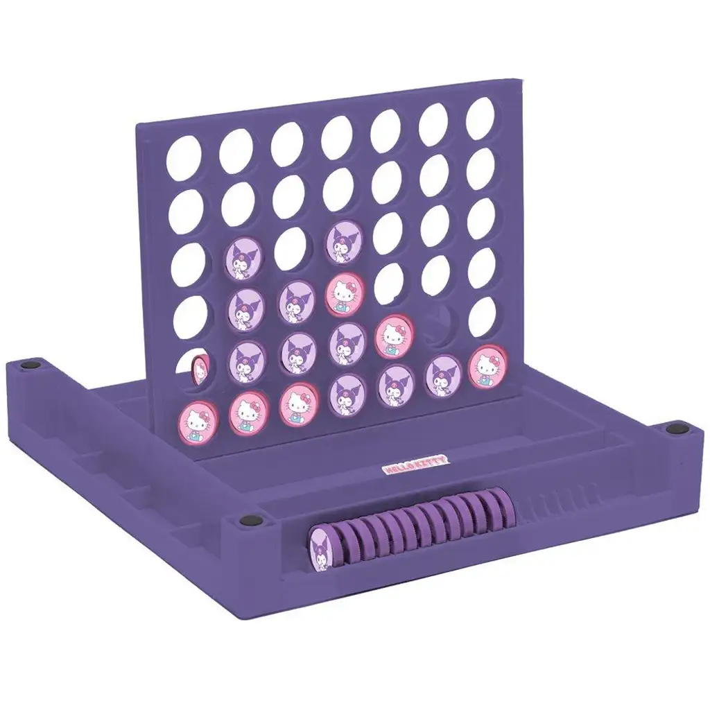 Na jedné straně hrací desky vás čeká dobře známá hra „Hadi a žebříky“, kde děti postupují vpřed po poli pomocí hodu kostkou. Žebříky jim pomáhají nahoru, „hadi“ (ve veselé podobě stuh) je vracejí zpět, takže hra je vždy plná překvapení. Druhá strana je určena hře „4 v řadě“, kde je cílem jako první vytvořit čtyři stejné symboly (Hello Kitty nebo Kuromi) vodorovně, svisle nebo diagonálně.